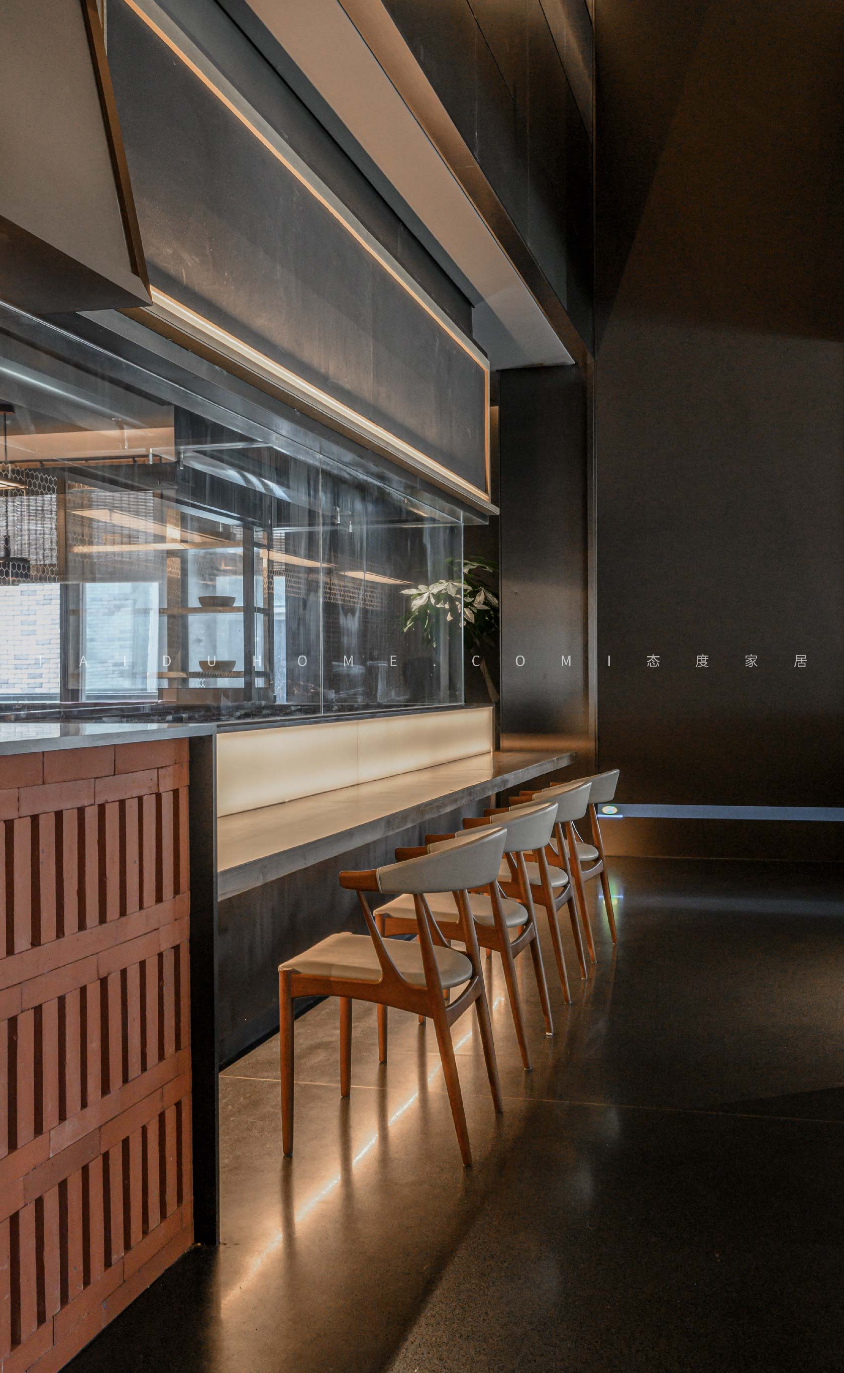 客人进入板前,昏黄的灯光、浅色餐椅以及原木色桌面使氛围变得温馨,营造出惬意的舒适感。透过玻璃,还能看到厨师在板前忙碌的身影。