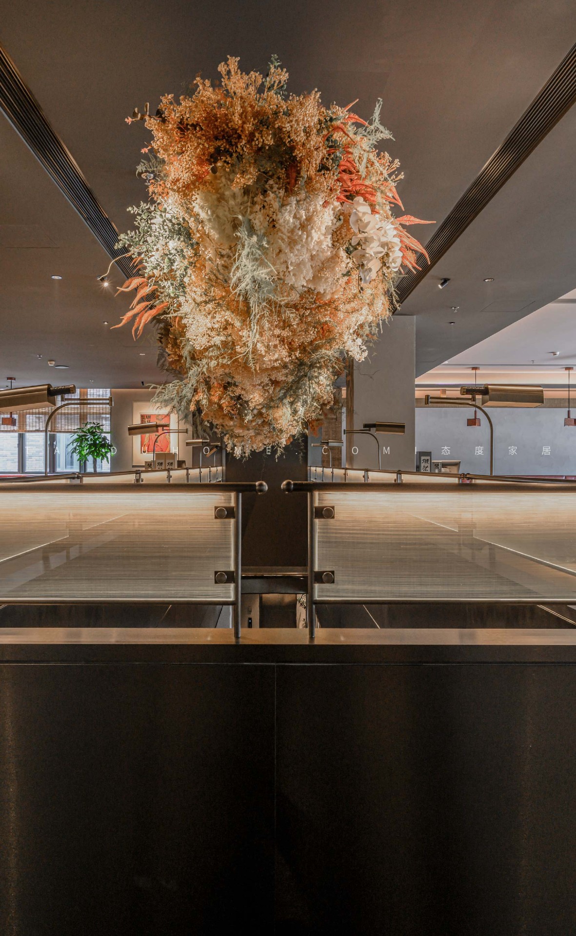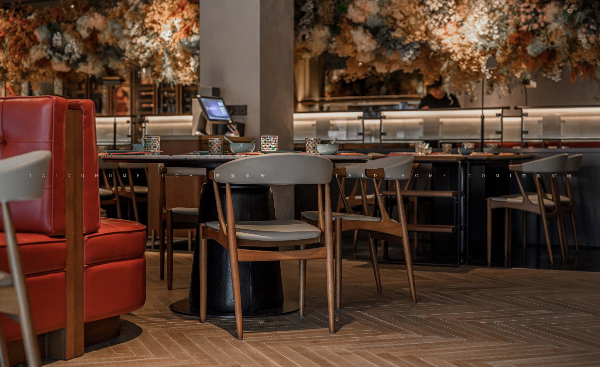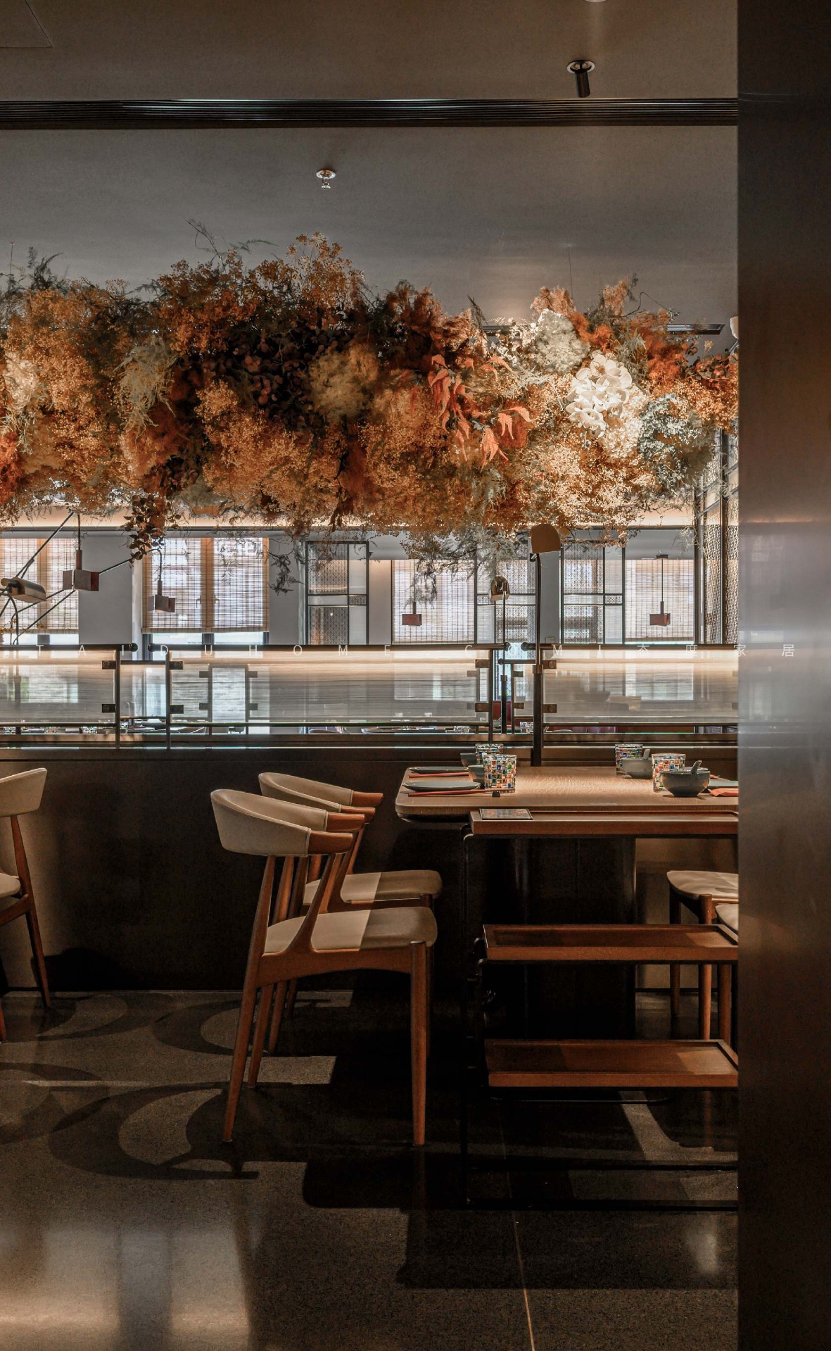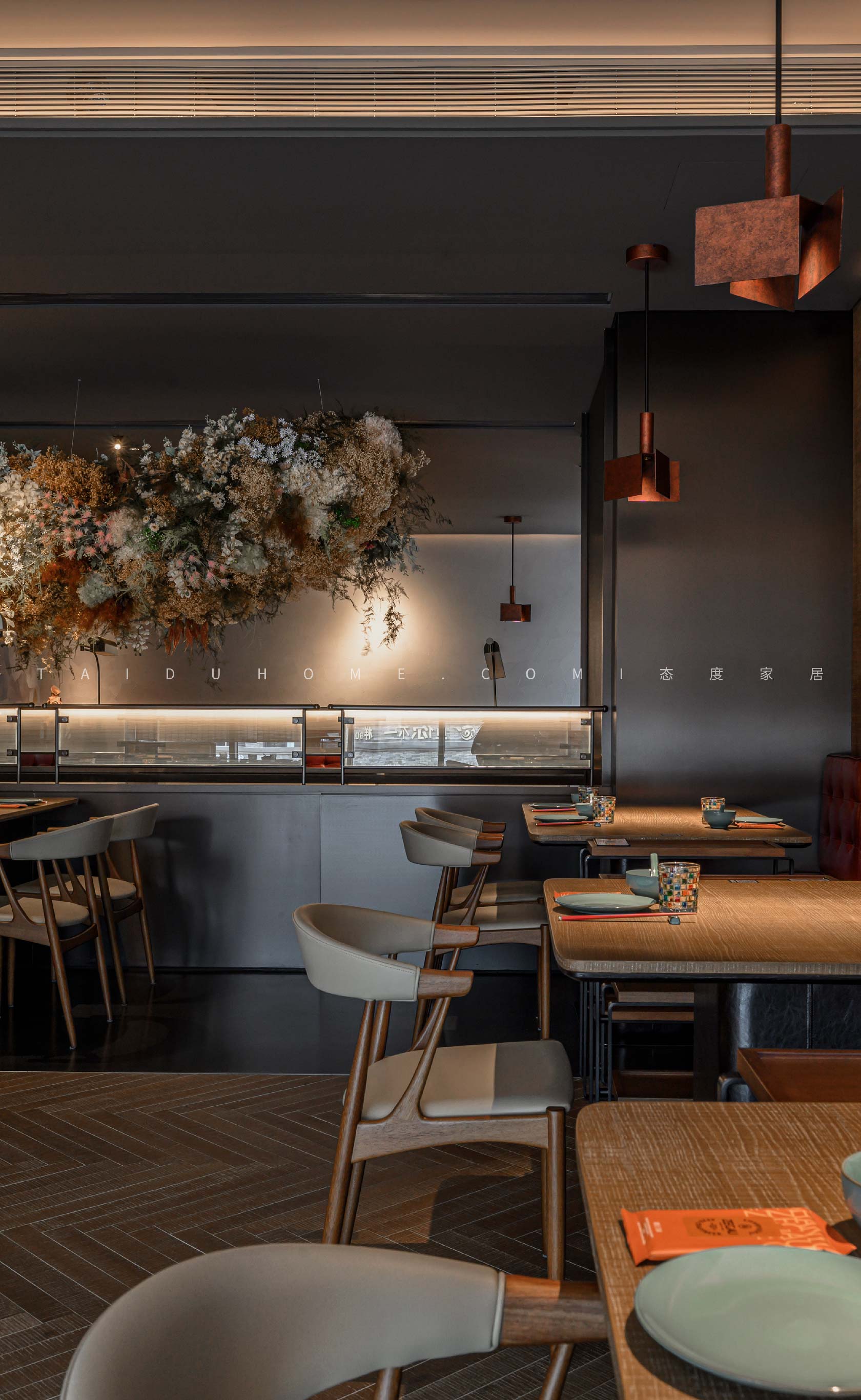 在原始水泥墙的包围中,通过高低错落的吊灯,暖光渲染用餐环境。花束环绕,光斑洒下来,在桌面闪转跳跃,寄托着营造者对品牌的祝福与期待。