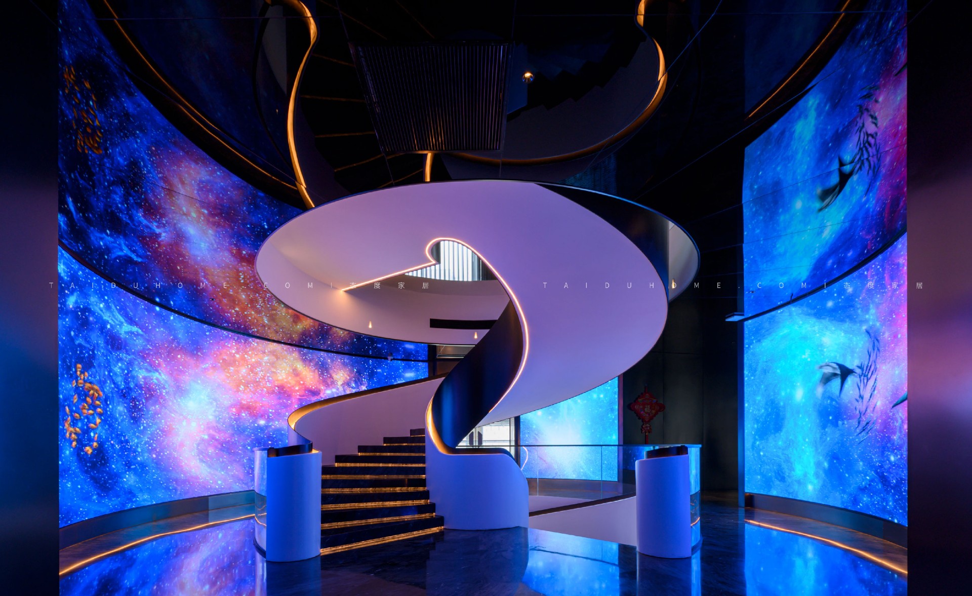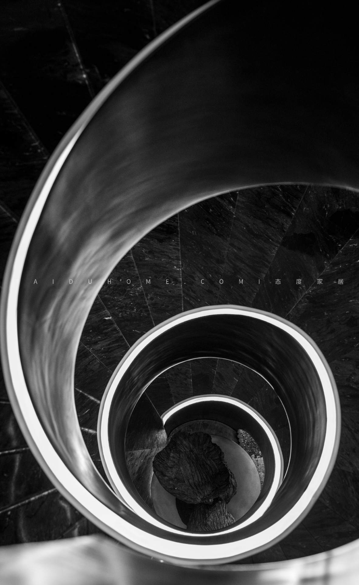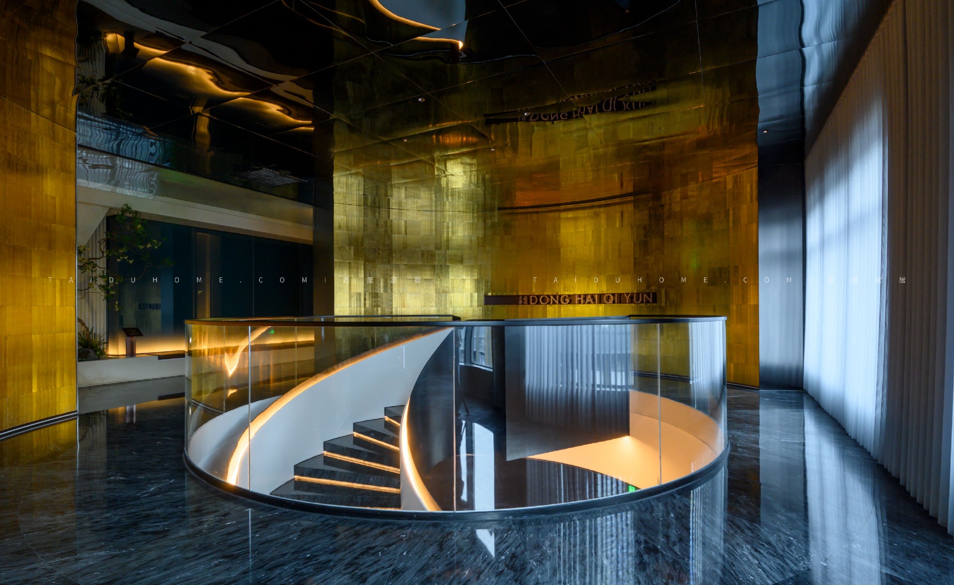 蜿蜒曲折的旋转楼梯仿佛时间的漩涡,又像是一件充满张力的现代装置艺术,以饱满的线条力度,引导空间自上而下逐层展演。让人仿佛置身于东海的空间感,装饰细节中流淌着海洋的美轮美奂。